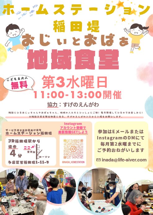 高齢者施設で開催する、地域のすべての方を対象とした地域食堂です。お食事と交流の場としてご利用ください。