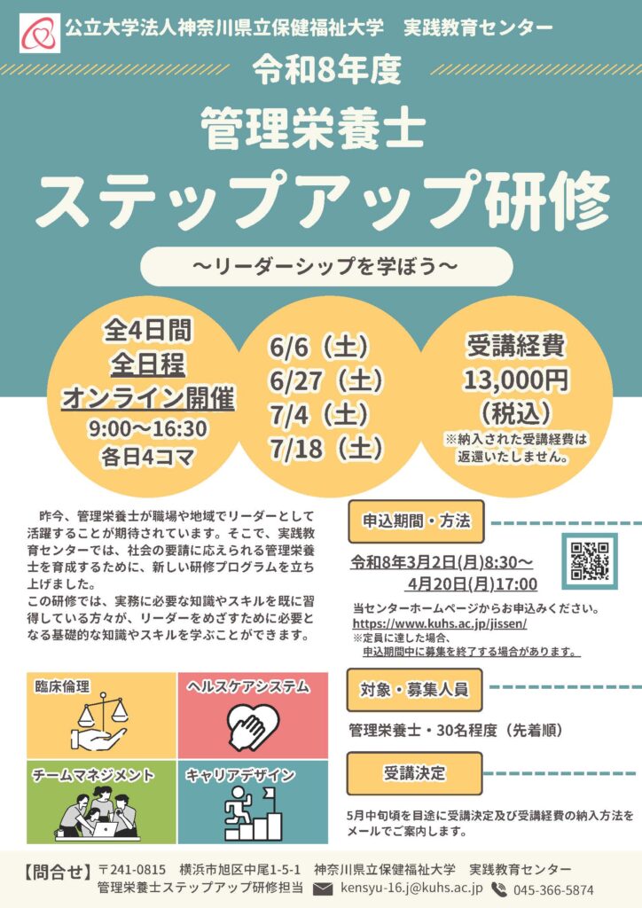 昨今、管理栄養士が職場や地域でリーダーとして活躍することが期待されています。そこで、実践教育センターでは、社会の要請に応えられる管理栄養士を育成するために、新しい研修である「管理栄養士ステップアップ研修」を開催します。