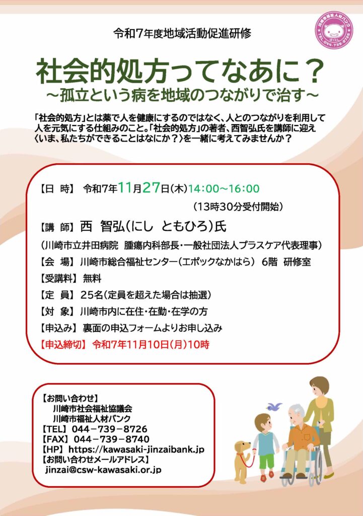 「社会的処方」とは薬で人を健康にするのではなく、人とのつながりを利用して、人を元気にする仕組みのこと。「社会的処方」の著者、西智弘先生を講師に迎え、「孤立」の現状を知り、地域の中でどのようなつながりが大切なのか理解を深めます。「自分にできること」を一緒に考えてみませんか。