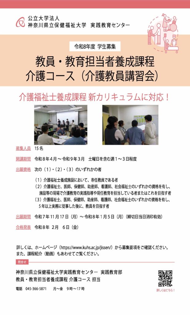 介護福祉士養成施設において専任教員を目指す方や、施設等の現場で介護教育の実践指導や現任教育を担当している方またはこれを目指す方を対象とした「令和8年度教員・教育担当者養成課程介護コース(介護教員講習会)」の学生募集を開始しています。