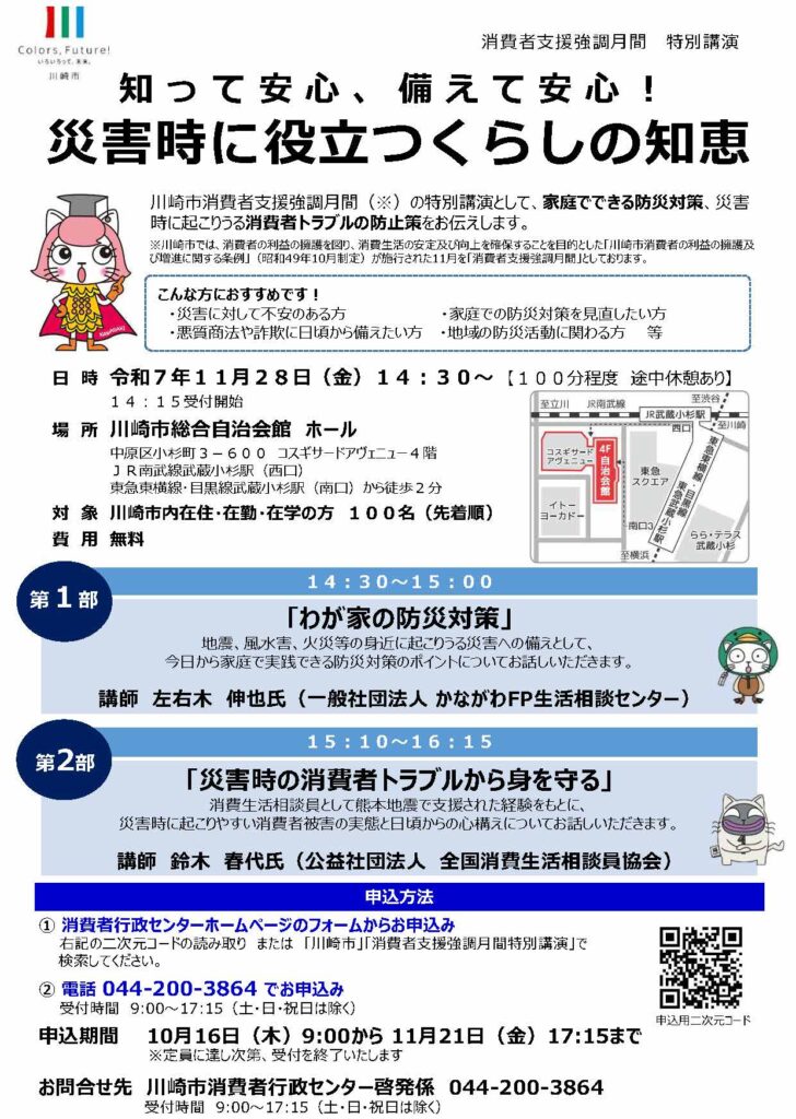 川崎市消費者支援強調月間特別講演として、家庭でできる防災対策、災害時に起こりうる消費者トラブルの防止策をお伝えします。災害に対して不安のある方、家庭での防災対策を見直したい方、悪質商法や詐欺に日頃から備えたい方 、地域の防災活動に関わる方等、興味のある方はぜひご参加ください!