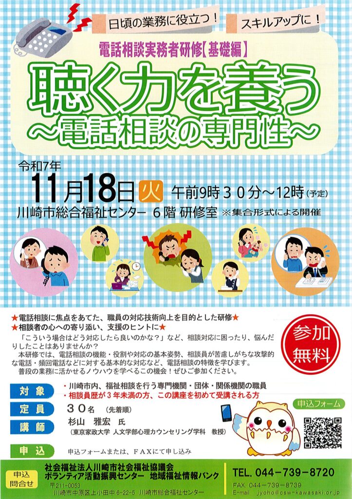 本研修では、電話相談の機能・役割や対応の基本姿勢、相談員が苦慮しがちな攻撃的な電話・頻回電話などに対する基本的な対応など、電話相談の特徴を学びます。